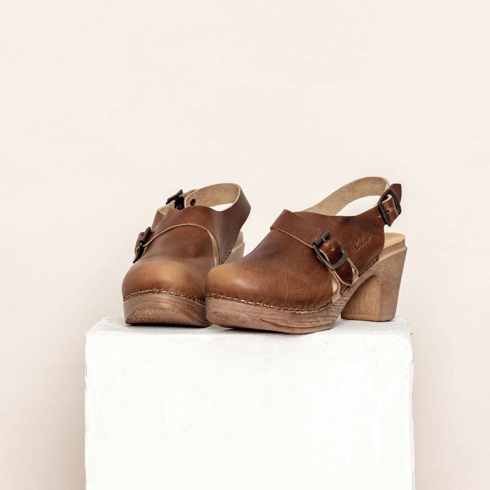 The Astrid slingback clog in brown is a classic clog brought up to date with double buckles and a side cut-out detail. The clog features a rounded toe and wood-effect platform sole that gives you height without the feeling of heels. Adjustable straps over the instep and behind the heel ensure a custom fit. The Astrid clog offers the all-day comfort you’d expect from a Calou clog – but with added style.