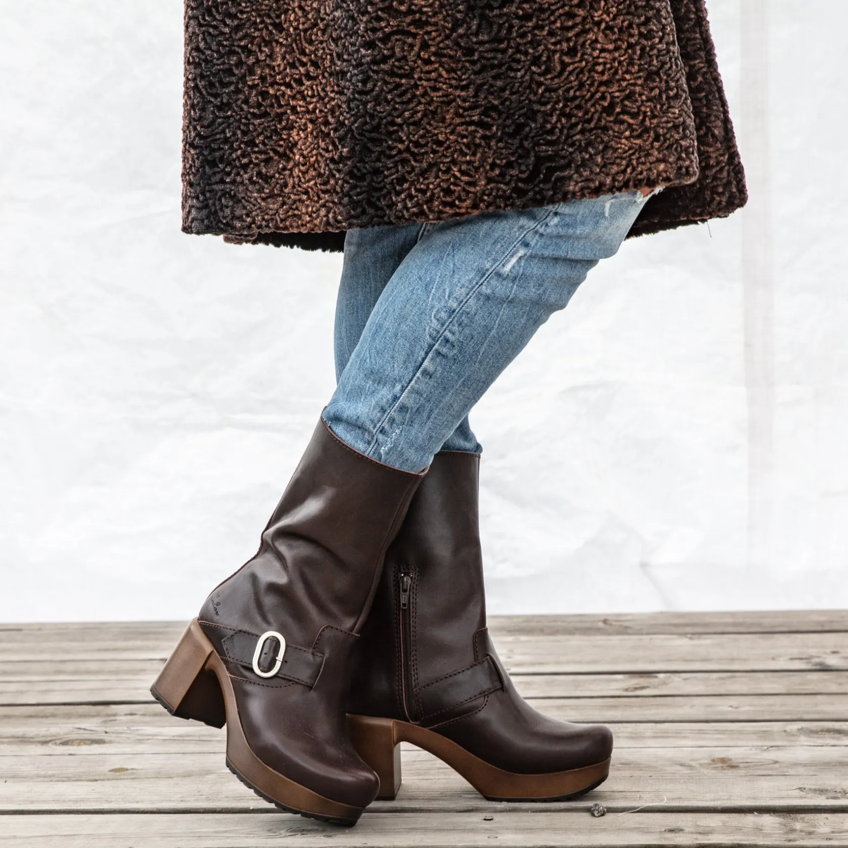 Juni is a boot with attitude! Hand crafted in brown leather, this mid-calf boot has a block heel and an on-trend buckle across the ankle. With a rounded toe, cushioned insole, supple leather and flexible sole, the Juni boot is both chic and comfortable.