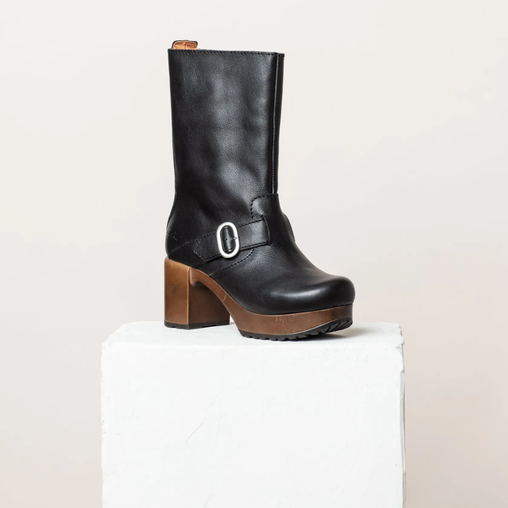 Make a statement with Juni, our mid-calf boot in black leather. With its chunky heel and buckle detail, it’s like a refined biker boot. The padded insole and flexible sole mean it’s supremely comfortable. Handmade in Portugal with the softest leather, the Juni boot features a rounded toe, mid-height block heel, and a zipper for easy wear.