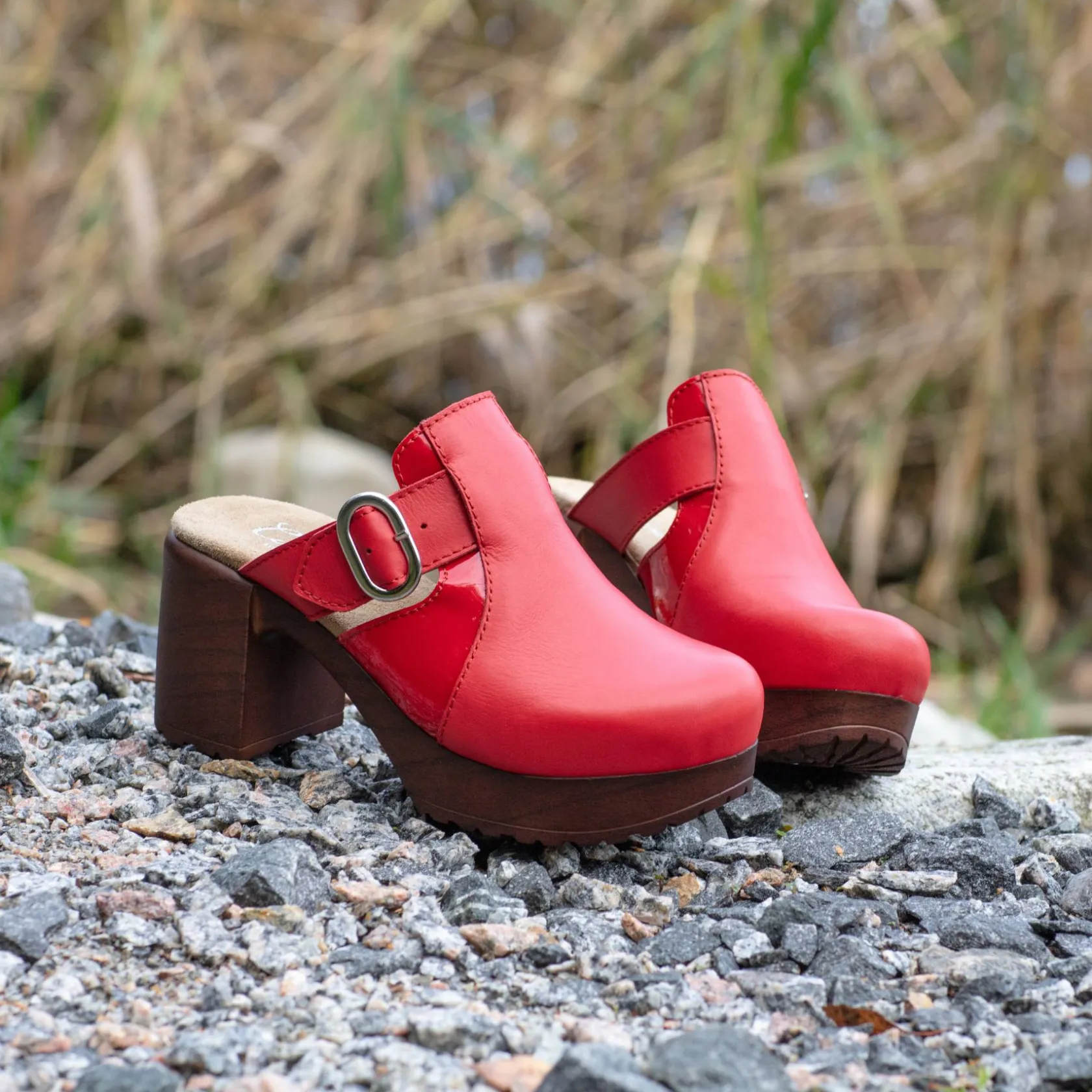So cool, so chic, our Sonja clog in vibrant red leather is sure to turn heads. This slip-on style features an adjustable side buckle for a custom fit and a flash of patent leather. The contrasting wood-like block heel and chunky platform sole give you height without sacrificing comfort. Handmade in Portugal, designed in Sweden.