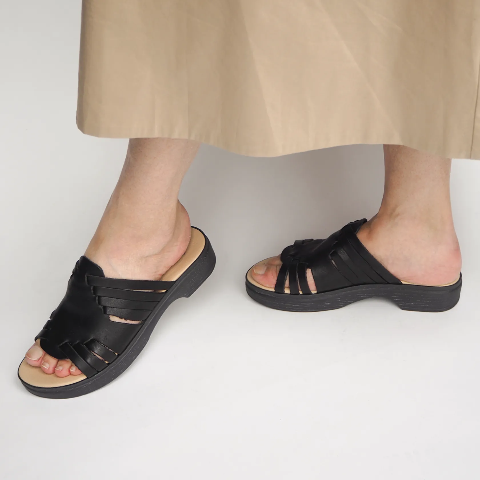 Introducing the Andrea Flat Clog Sandal, where comfort meets style in every step. Andrea features an open toe and a beautifully braided black leather upper. Crafted with care and attention to detail, these flat clog sandals offer the perfect blend of fashion and functionality. The cushioned insole ensures all-day comfort, while the sturdy construction provides stability with every stride.