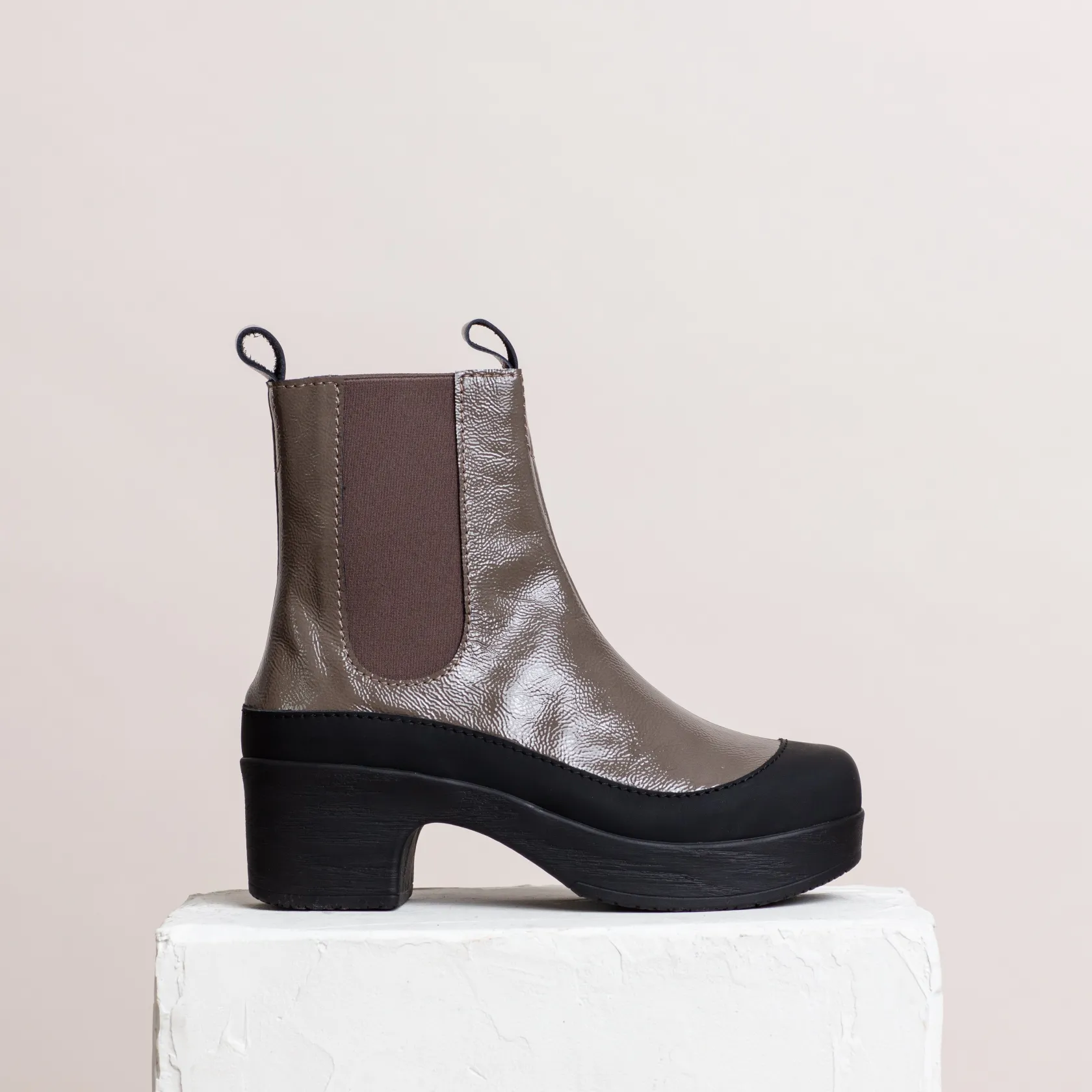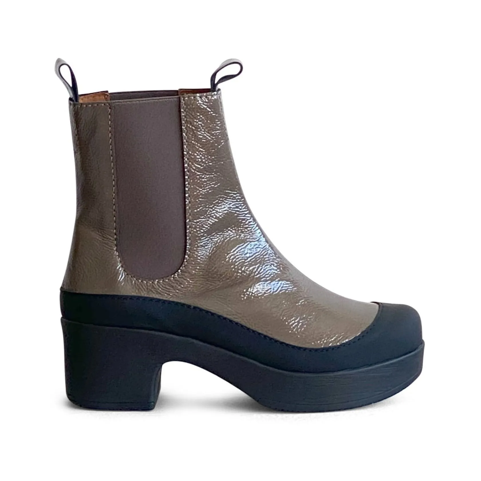 The pull-on Susie Chelsea boot in patent grey leather is the perfect mix of style and function. The patent leather brings a touch of glam to the boot, while the waterproof rubber trim protects from damp and dirt. A removable anatomical insole gives optimal foot support. The Susie Boot is handmade in Portugal.