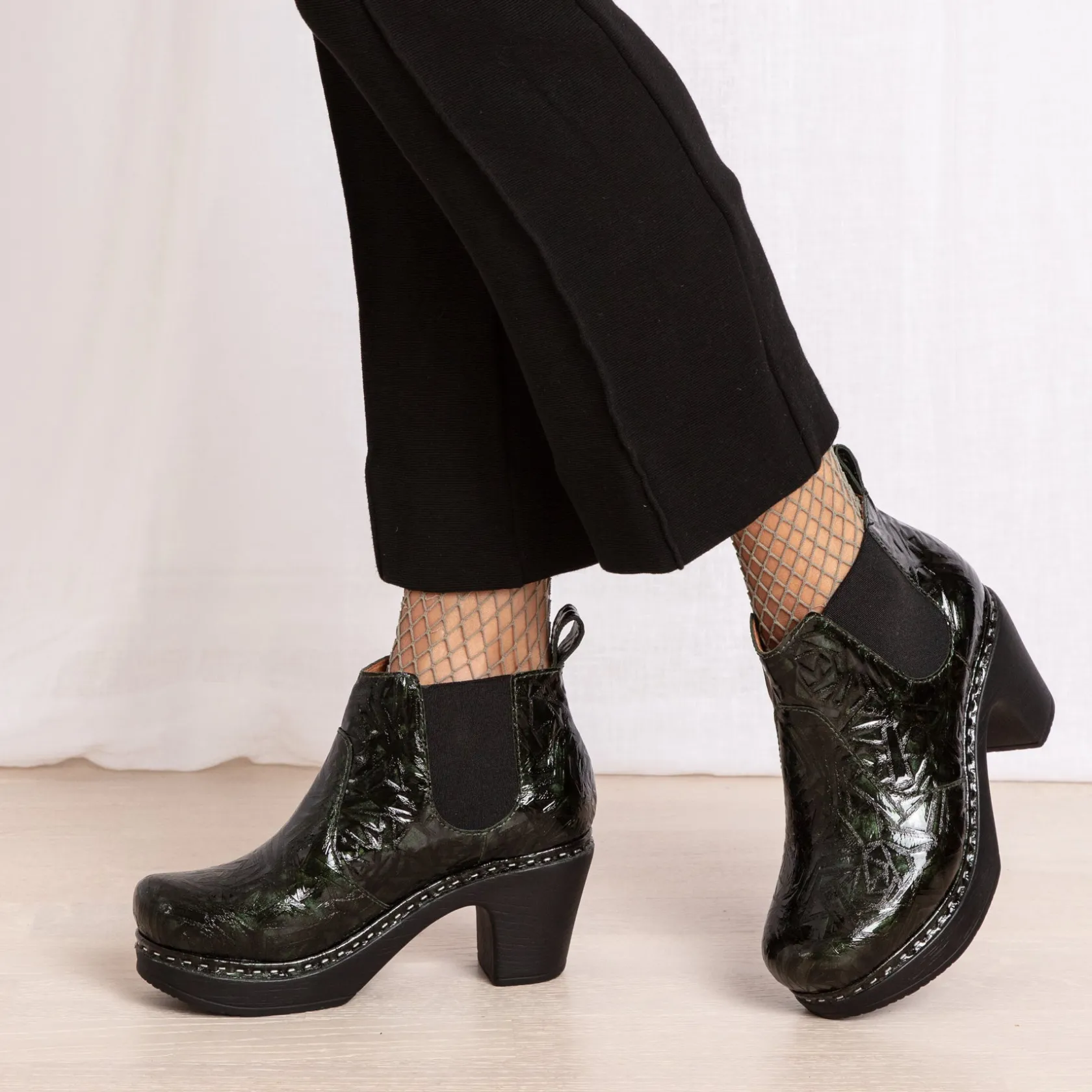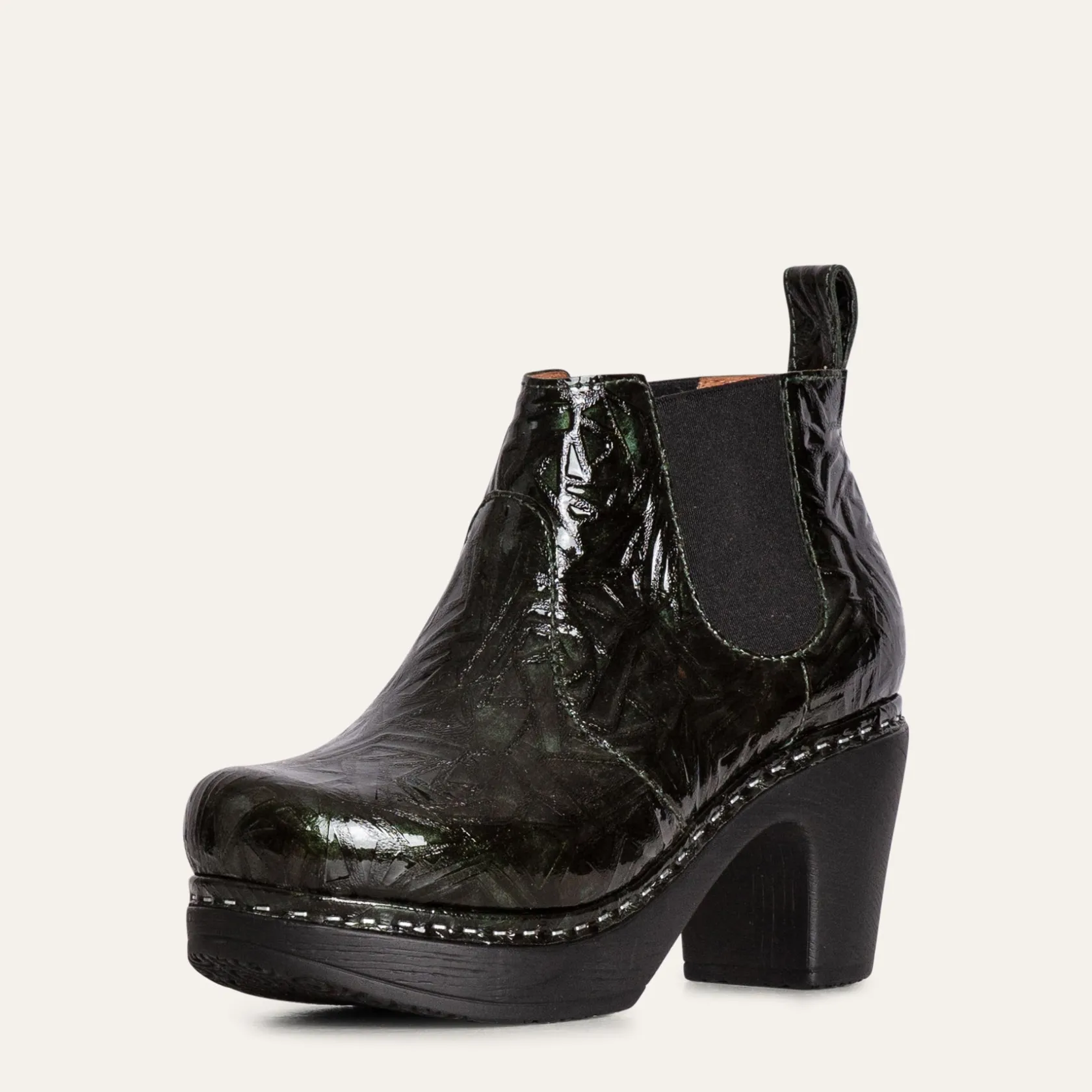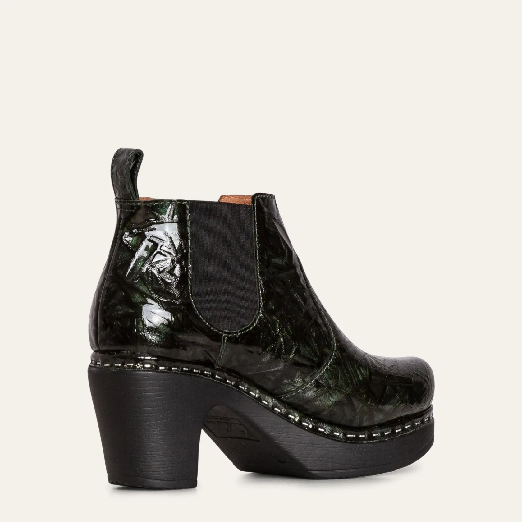 Make a statement with this perfect little ankle boot in luxurious green patent leather embossed with Picasso roses. With its rounded toe, clog-style sole, Doris has the look of a traditional clog boot but with the easy wear of a Chelsea boot. The cushioned, flexible sole and elastic sides support your foot and provide optimal comfort. Handmade in Portugal, designed in Sweden.