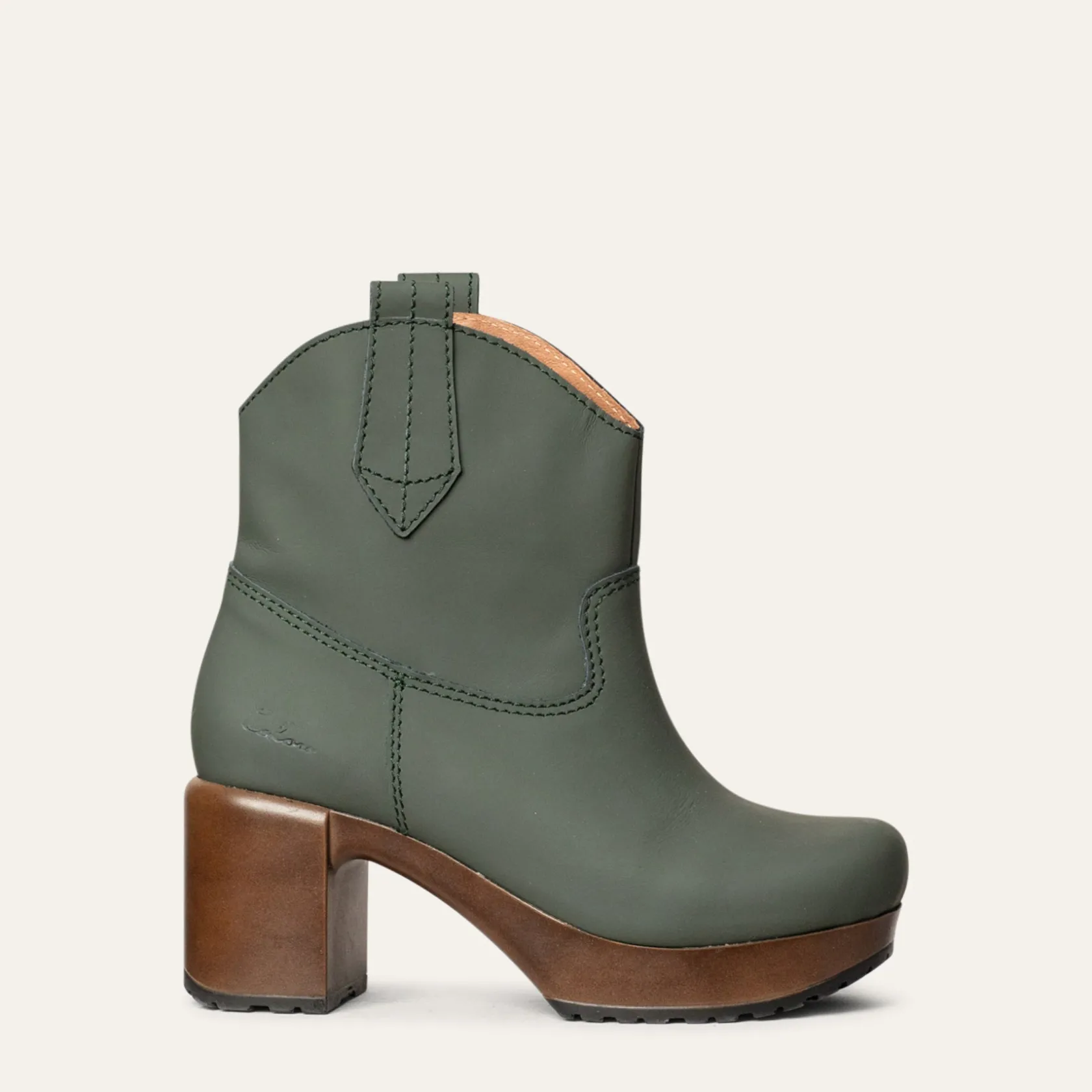 The Malin cowboy boot in water-resistant olive leather is both stylish and practical. The upturned toe, visible stitching and dual leather pull-tabs give this boot a Western, cowboy boot look, while the traditional clog-style block heel and sole add some height and a stylish twist. The soft, flexible sole means the Malin ankle boot can be worn comfortably all day long.