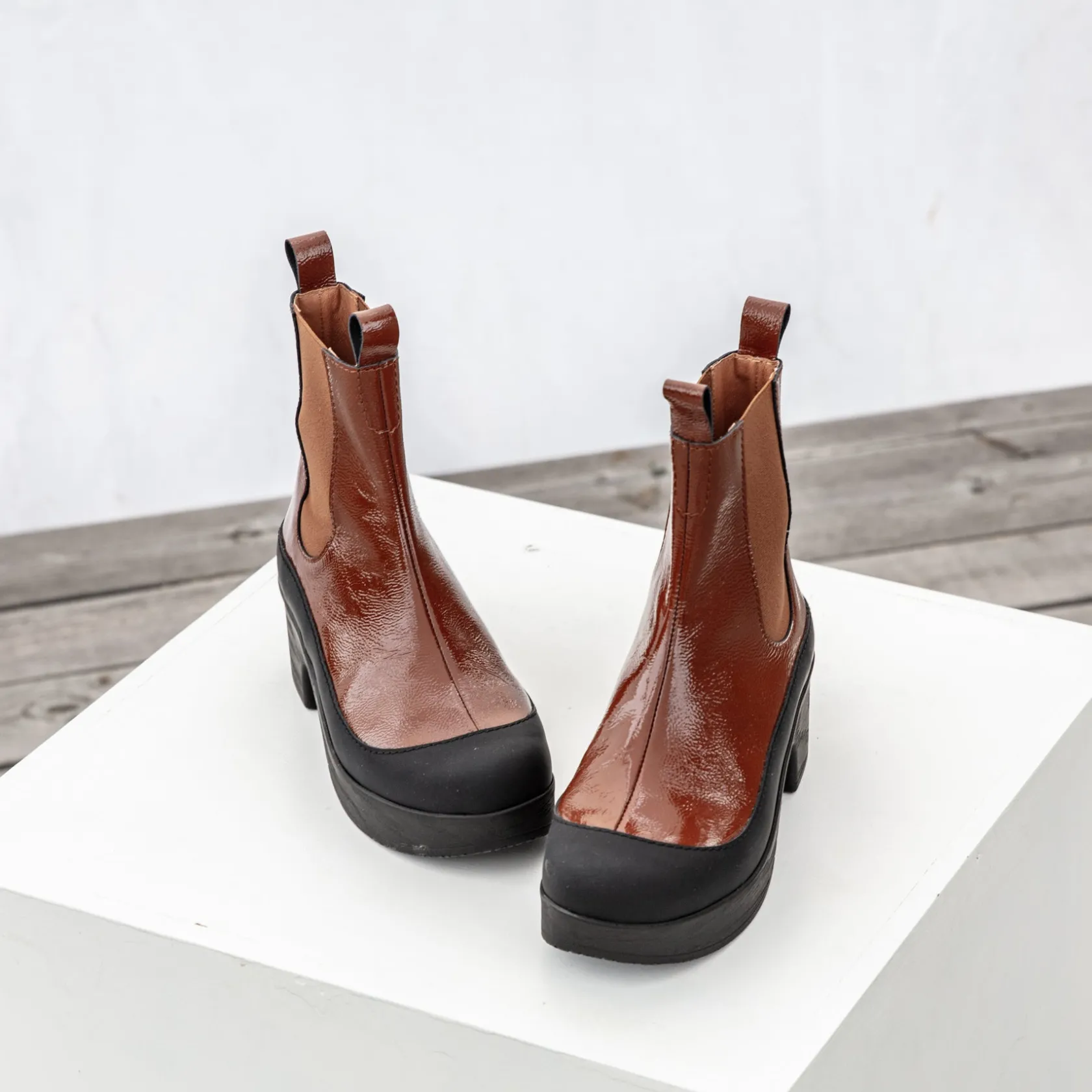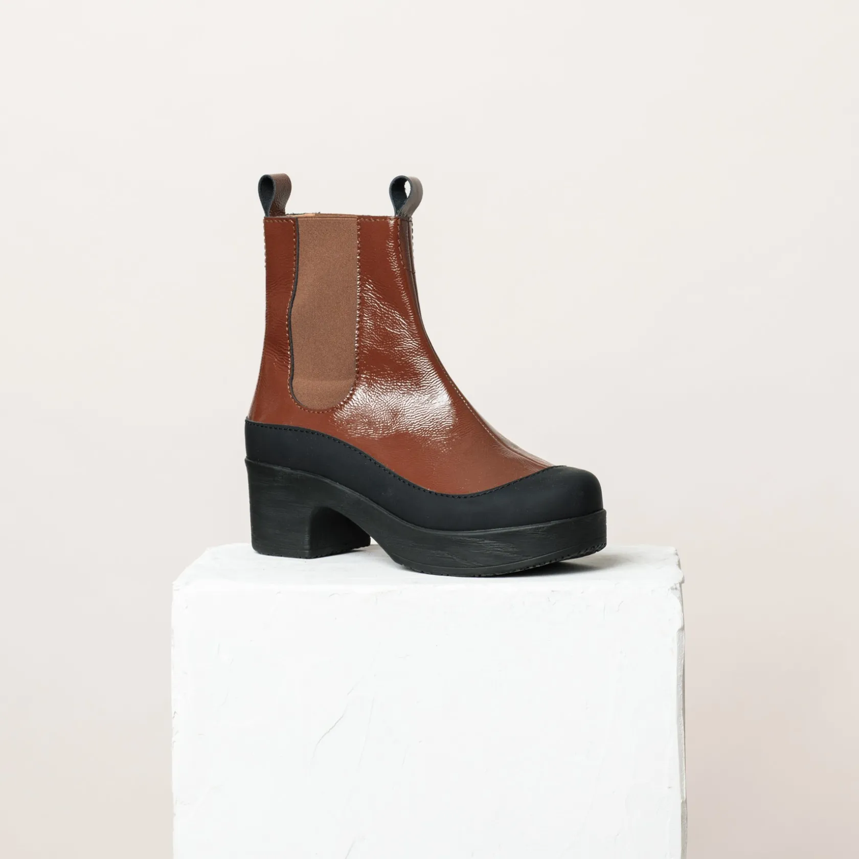 Bringing something extra to the classic Chelsea boot style, the Susie Patent Tan Boot combines a chunky sole with chic patent leather. Perfect for fall and winter, the waterproof rubber edge is both stylish and practical. Handmade in Portugal, the Susie Boot features a rounded toe, elastic sides with pull-on tabs, and an anatomical sole for extra support.