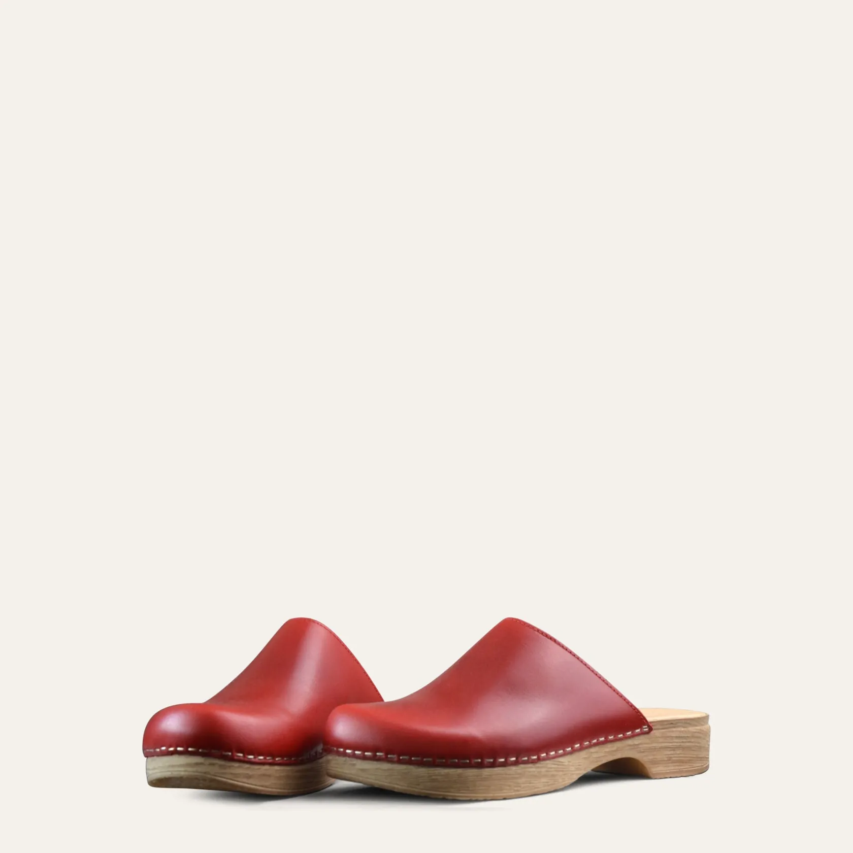 The Helena classic clog is one of our all-time favorites. It has the look of a traditional clog but on a flat base. Red leather. With its cushioned, flexible sole, the Helena clog is both stylish and easy to wear. Designed in Sweden and handmade in Italy.